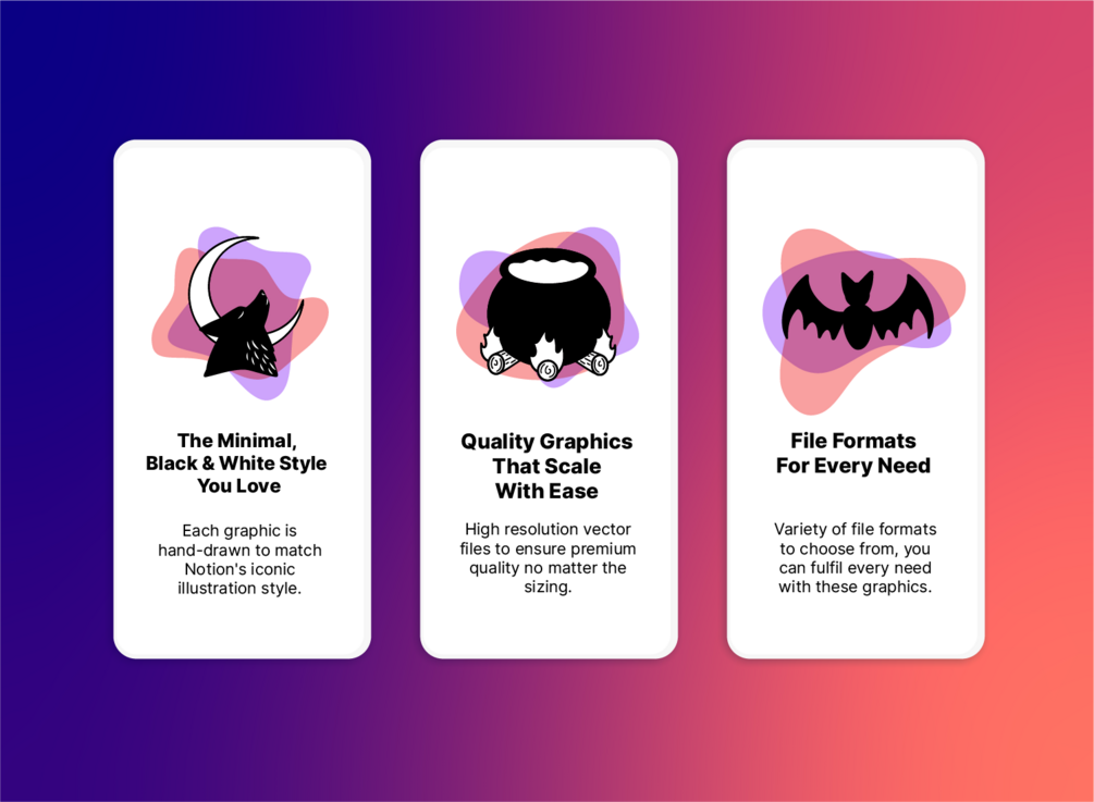 This icon pack was designed in the same minimalistic black and white style you've likely seen on Notion.so. Each is drawn by hand and recreated in vector format, you can rest assure that your new icons will scale with ease without losing any quality in the process.